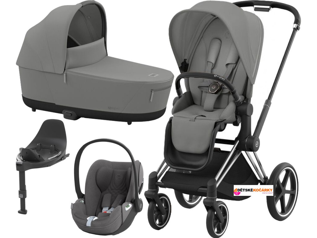 Set obsahuje: podvozek Priam Chrome Black + Priam Seat Pack + hlubokou korbu CYBEX Priam Lux Carry Cot + autosedačku CYBEX Cloud T i-Size PLUS + otočnou základnu Base T