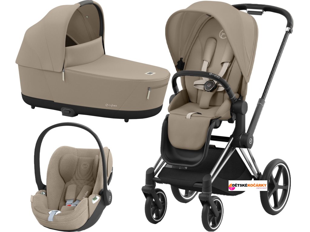 Set obsahuje: podvozek Priam Chrome Black + Priam Seat Pack + hlubokou korbu CYBEX Priam Lux Carry Cot + autosedačku CYBEX Cloud T i-Size PLUS