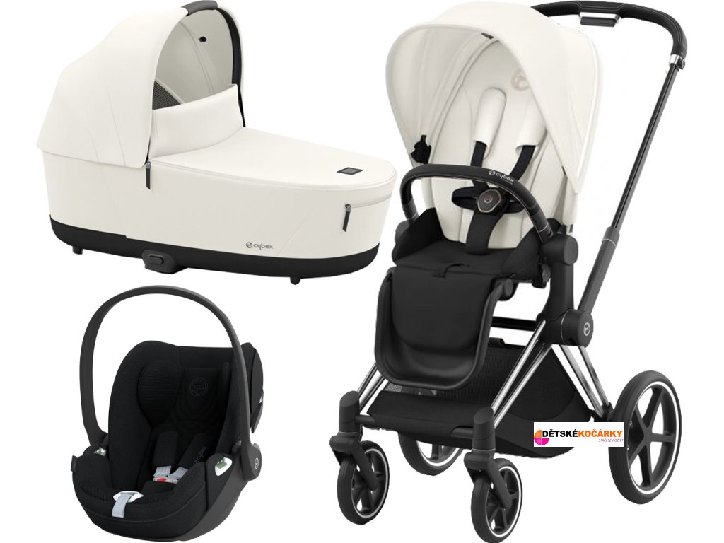 Set obsahuje: podvozek Priam Chrome Black + Priam Seat Pack + hlubokou korbu CYBEX Priam Lux Carry Cot + autosedačku CYBEX Cloud T i-Size PLUS