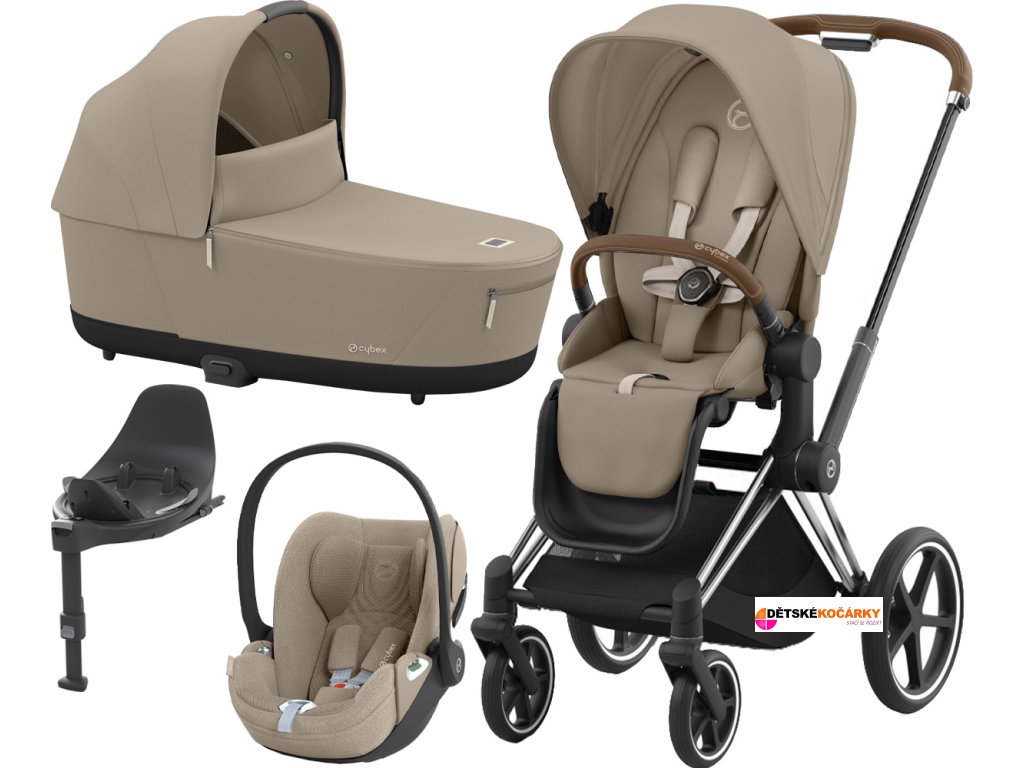 Set obsahuje: podvozek Priam Chrome Brown + Priam Seat Pack + hlubokou korbu CYBEX Priam Lux Carry Cot + autosedačku CYBEX Cloud T i-Size PLUS + otočnou základnu Base T