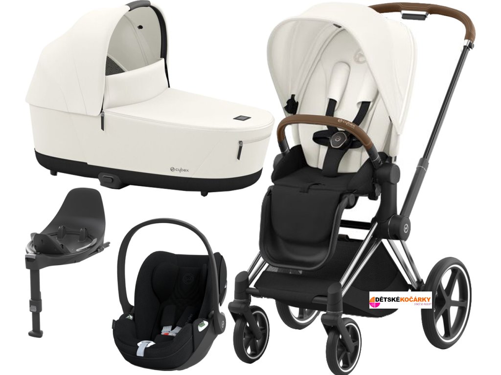 Set obsahuje: podvozek Priam Chrome Brown + Priam Seat Pack + hlubokou korbu CYBEX Priam Lux Carry Cot + autosedačku CYBEX Cloud T i-Size PLUS + otočnou základnu Base T