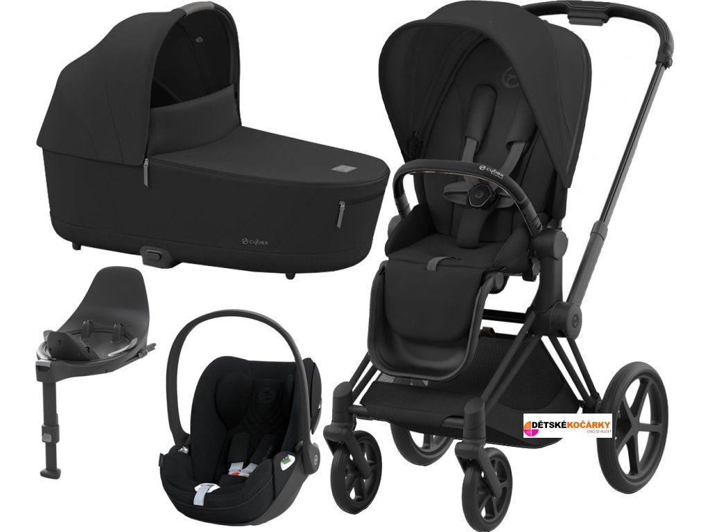Set obsahuje: podvozek Priam Matt Black + Priam Seat Pack + hlubokou korbu CYBEX Priam Lux Carry Cot + autosedačku CYBEX Cloud T i-Size PLUS + otočnou základnu Base T