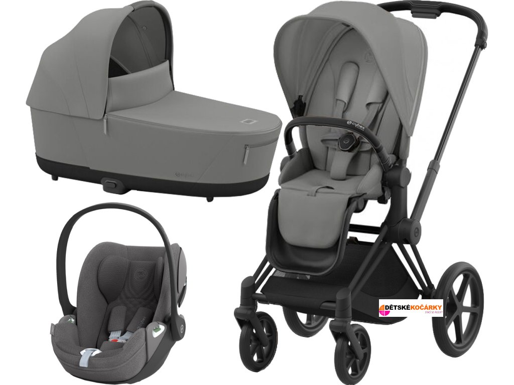 Set obsahuje: podvozek Priam Matt Black + Priam Seat Pack + hlubokou korbu CYBEX Priam Lux Carry Cot + autosedačku CYBEX Cloud T i-Size PLUS