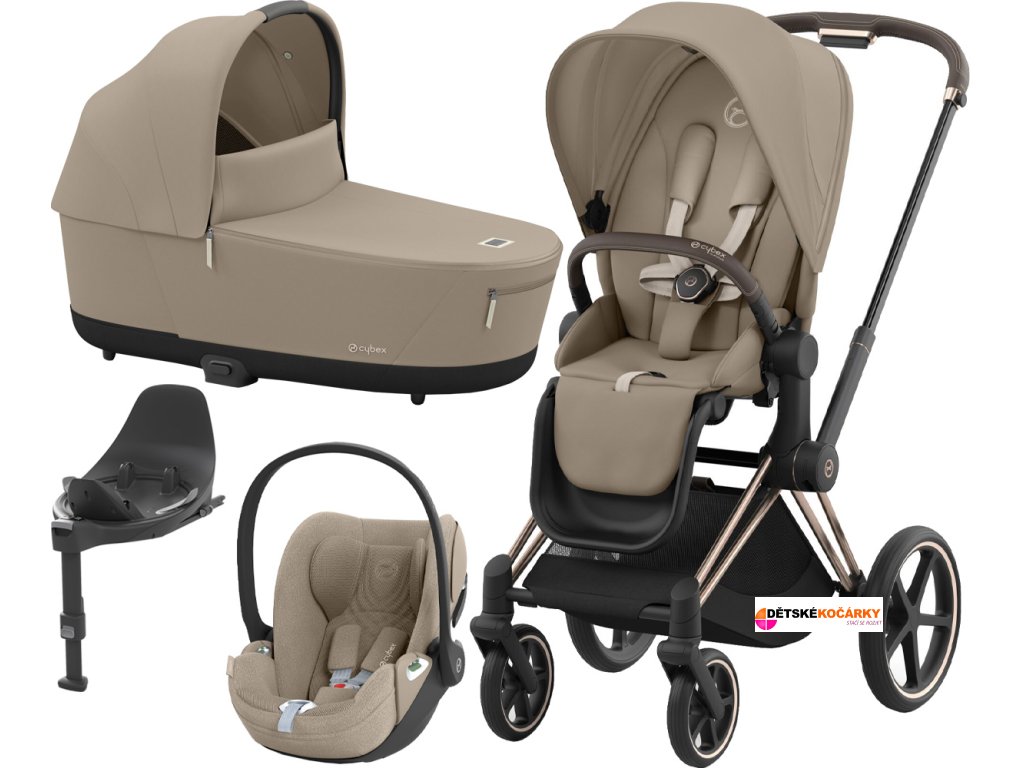 Set obsahuje: podvozek Priam Rosegold + Priam Seat Pack + hlubokou korbu CYBEX Priam Lux Carry Cot + autosedačku CYBEX Cloud T i-Size PLUS + otočnou základnu Base T
