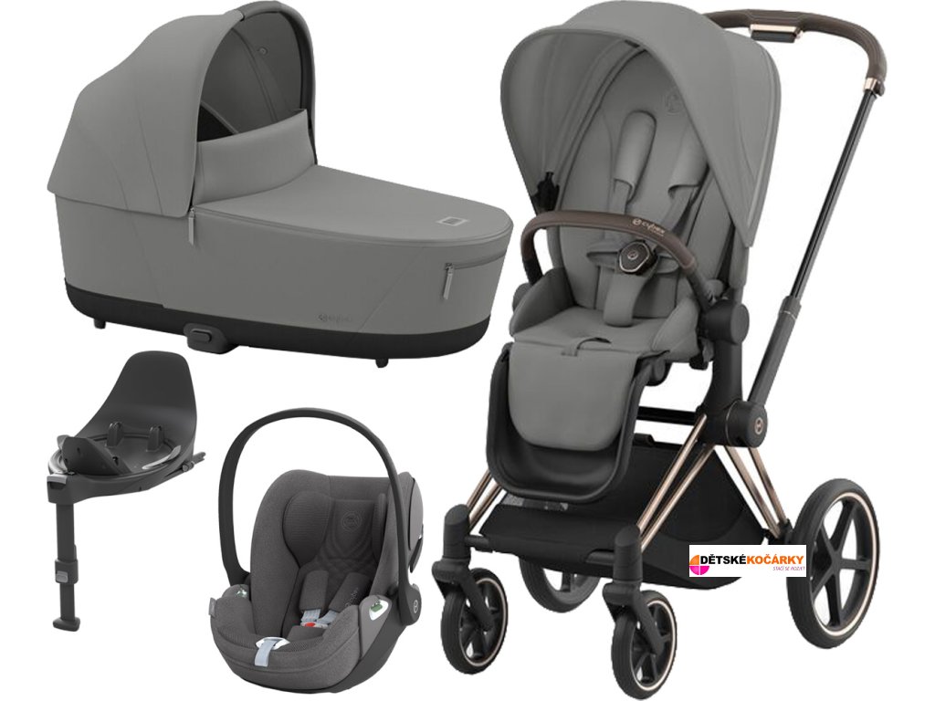Set obsahuje: podvozek Priam Rosegold + Priam Seat Pack + hlubokou korbu CYBEX Priam Lux Carry Cot + autosedačku CYBEX Cloud T i-Size PLUS + otočnou základnu Base T