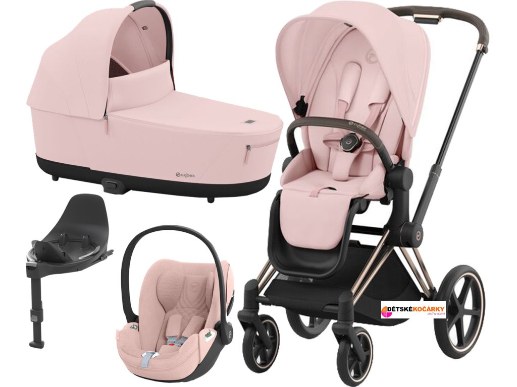 Set obsahuje: podvozek Priam Rosegold + Priam Seat Pack + hlubokou korbu CYBEX Priam Lux Carry Cot + autosedačku CYBEX Cloud T i-Size PLUS + otočnou základnu Base T