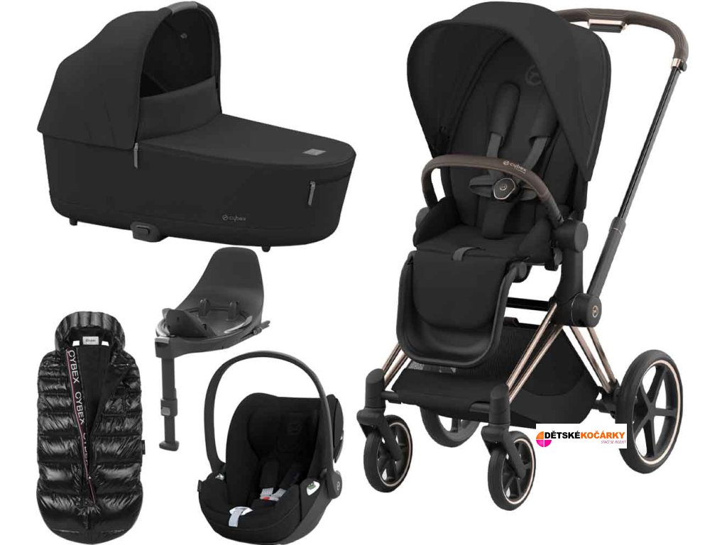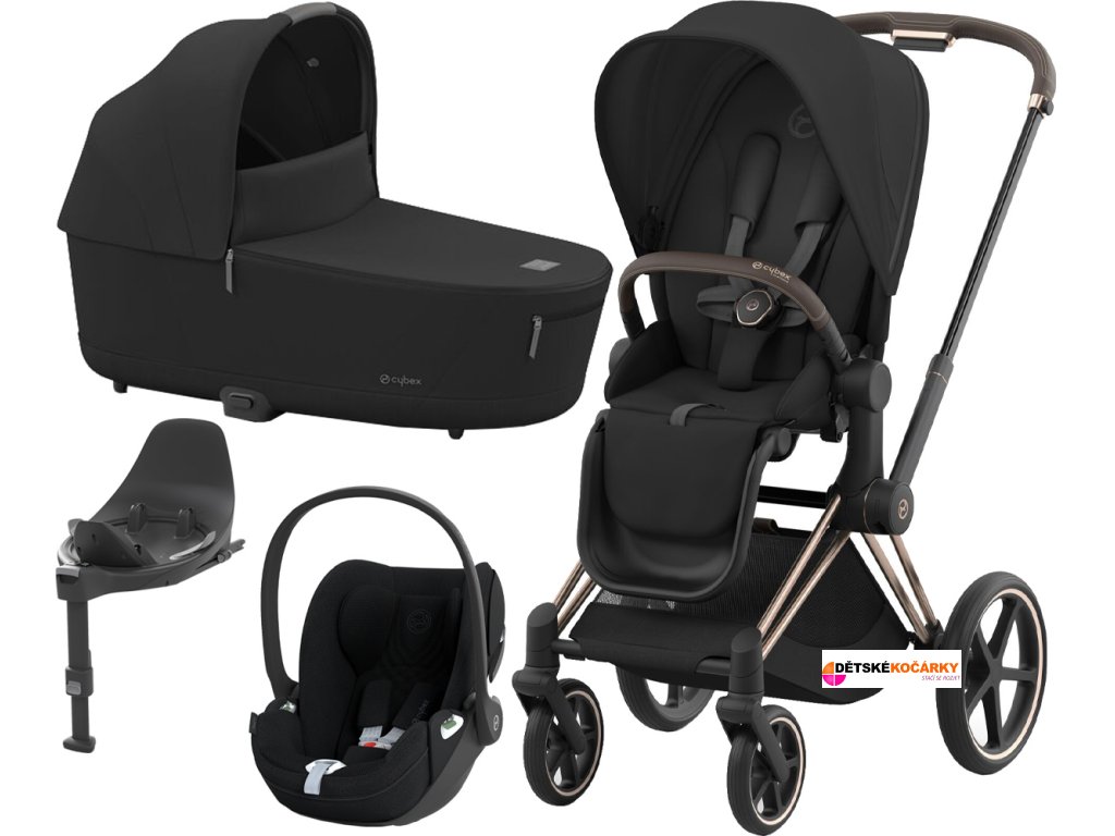Set obsahuje: podvozek Priam Rosegold + Priam Seat Pack + hlubokou korbu CYBEX Priam Lux Carry Cot + autosedačku CYBEX Cloud T i-Size PLUS + otočnou základnu Base T