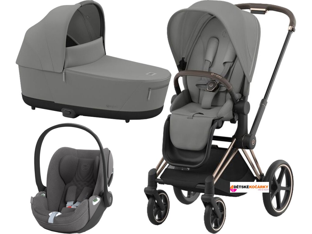 Set obsahuje: podvozek Priam Rosegold + Priam Seat Pack + hlubokou korbu CYBEX Priam Lux Carry Cot + autosedačku CYBEX Cloud T i-Size PLUS