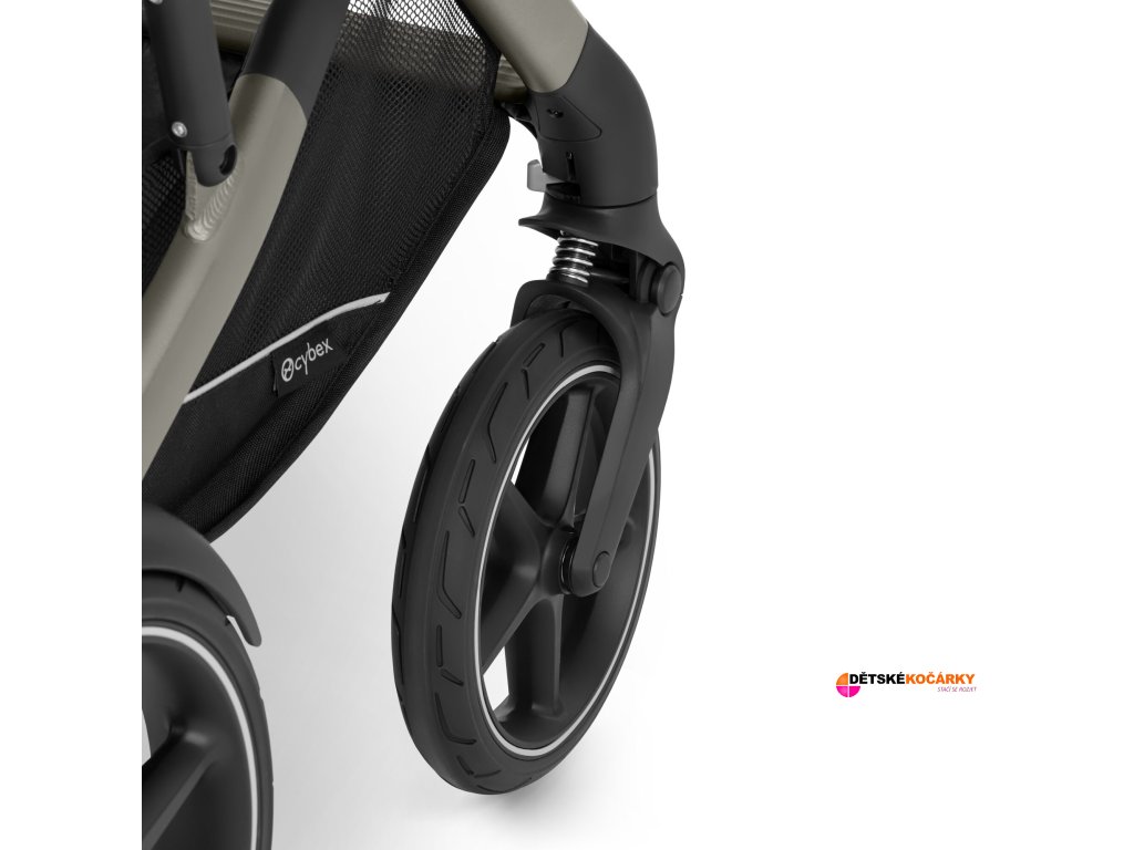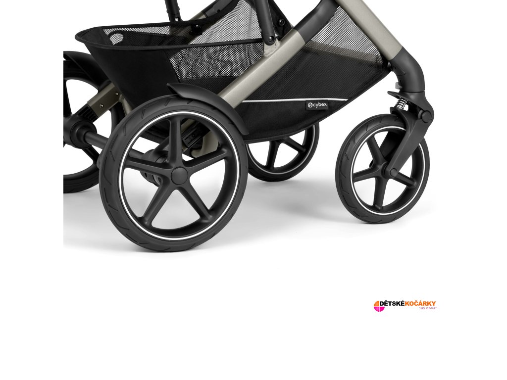 Kola kočárku mají stejný průměr, ale jsou nově užší, což stále splňuje kritéria pro jízdu v terénu a zároveň přispívá k menší hmotnosti. Jejich jedinečné odpružení všech kol eliminuje každou nerovnost terénu a zajišťuje tak dítěti pohodlnou jízdu. Nový model je dále vylepšen o designové blatníky, které chrání před nečistotami, a oblou rukojeť pro příjemnější úchop. Sportovní nástavba má nyní také otevřené držení nohou pro větší volnost.