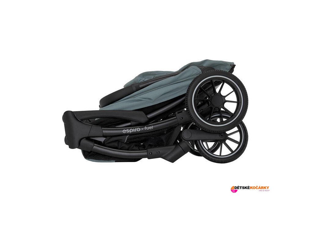 Kompaktní kočárek na extra velkých kolech s moderním systémem automatického skládání. Model ESPIRO Fuel díky plnému tlumení nárazů bude perfektní na procházky v přírodě i v rušných ulicích města. Stříška kočárku je navíc rozšířená, skvěle ochrání dítě nejen před nadměrným sluncem, ale i větrem či deštěm, navíc materiál má sluneční filtr UPF 50+. Na zadní straně opěradla je plné ventilační okénko, které je ideální pro zdřímnutí za slunečného letního dne. Nastavitelné bezpečnostní pásy, sklon sedáku a opěrka nohou zaručují snadné přizpůsobení kočárku rostoucímu dítěti.