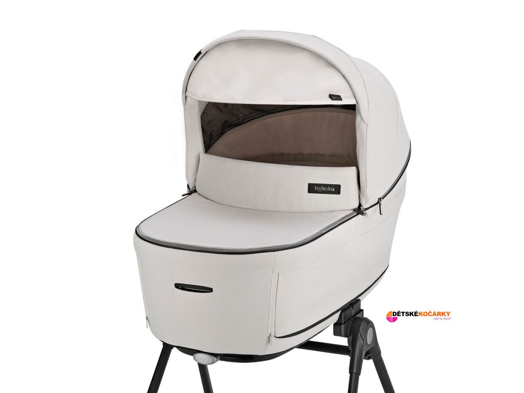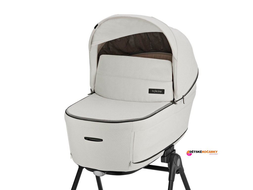 Set obsahuje: podvozek INGLESINA Aptica + hlubokou korbičku + sportovní sedačku + stojan Stand UpTM + matraci Welcome PadTM + madlo + nánožník + košík pod kočárek + držák nápojů