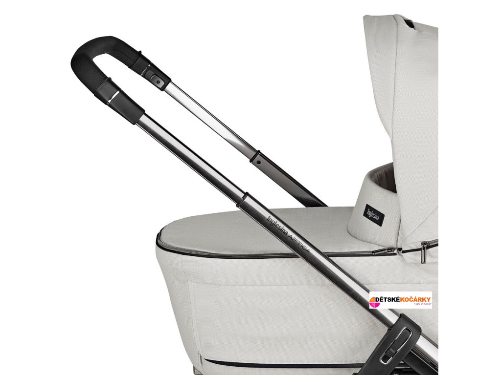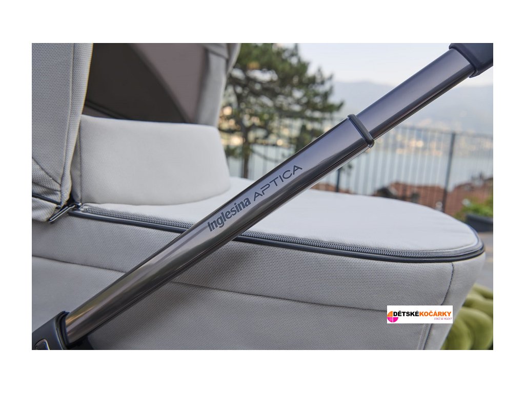 Odlehčený podvozek INGLESINA Aptica s třpytivým lesklým povrchem s odpružením pro všechny typy povrchů je navržen tak, aby dokonale kombinoval maximální lehkost s výkonem crossoveru, což zaručuje hladkou jízdu ve všech typech povrchů a mimořádně snadné používání. Podvozek má dvě inovativní lesklé povrchové úpravy, palladium a lithium, které dodávají kočárkům Aptica jedinečný, moderní a rafinovaný styl. Nové chromové a ušlechtilé detaily dodávají stylový nádech, který vyvažuje eleganci a půvab. Nová rukojeť z ekokůže s mikroperforovanou texturou kombinuje styl a funkčnost.
