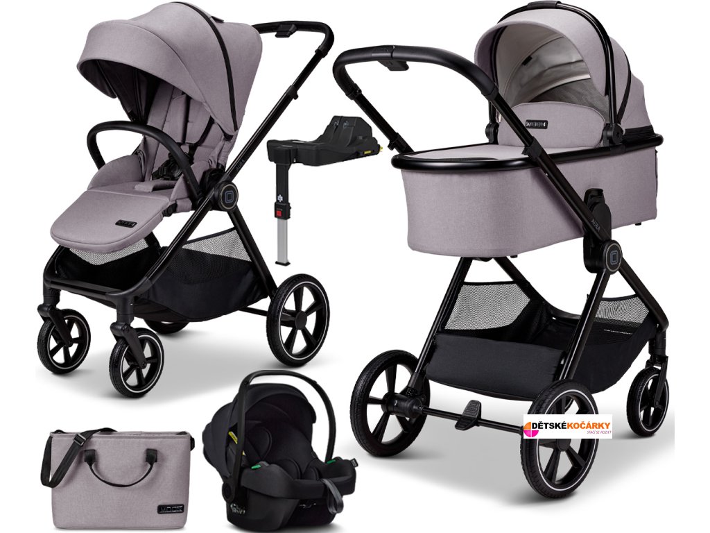 Set obsahuje: podvozek MOON Aura + sportovní sedačku + hlubokou korbu + přebalovací tašku v designu kočárku + pláštěnku na sportovní sedačku a korbu + výškové adaptéry pro hlubokou korbu + autosedačku Cosmo Black + Isofix Base Cosmo 2.0 + adaptéry pro autosedačku Cosmo 2.0