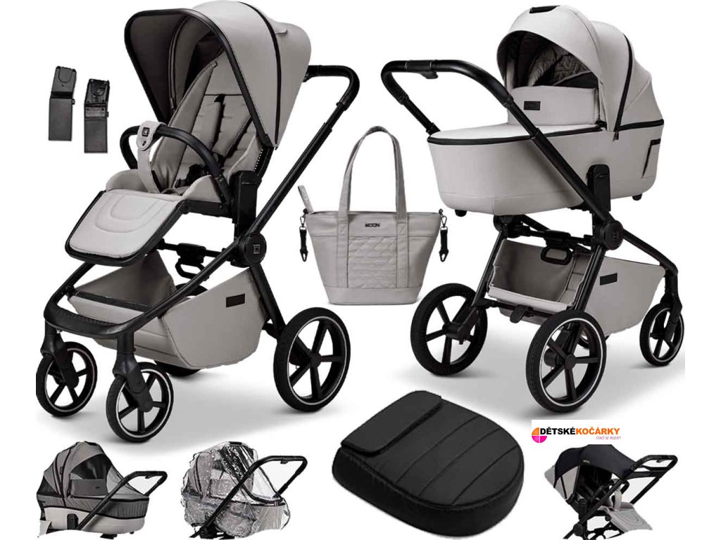 Set obsahuje: podvozek MOON Resea 2.0 + sportovní sedačku + hlubokou korbu + adaptéry pro usazení autosedačky + pláštěnku + moskytiéru + sluneční clonu + nánožník na sportovní sedačku ve variantě Black + přebalovací tašku v designu kočárku