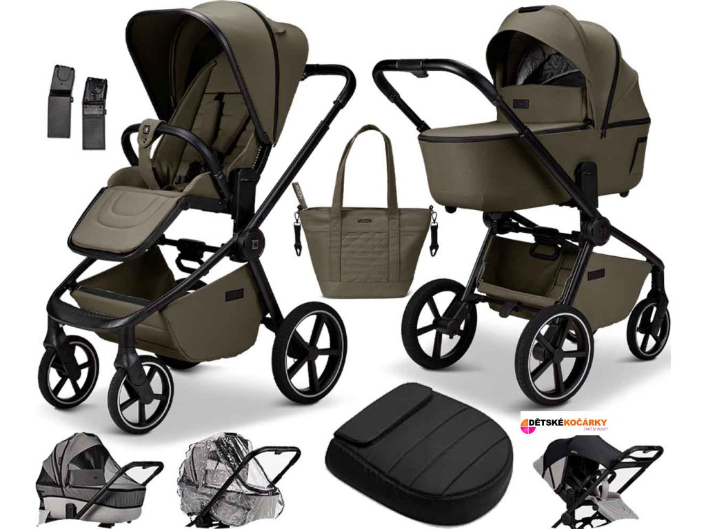 Set obsahuje: podvozek MOON Resea 2.0 + sportovní sedačku + hlubokou korbu + adaptéry pro usazení autosedačky + pláštěnku + moskytiéru + sluneční clonu + nánožník na sportovní sedačku ve variantě Black + přebalovací tašku v designu kočárku