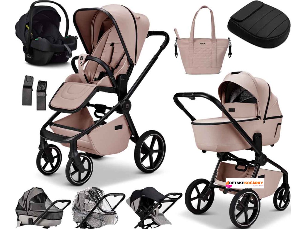 Set obsahuje: podvozek MOON Resea 2.0 + sportovní sedačku + hlubokou korbu + autosedačku Cosmo Black + adaptéry pro usazení autosedačky + pláštěnku + moskytiéru + sluneční clonu + nánožník na sportovní sedačku ve variantě Black + přebalovací tašku v designu kočárku