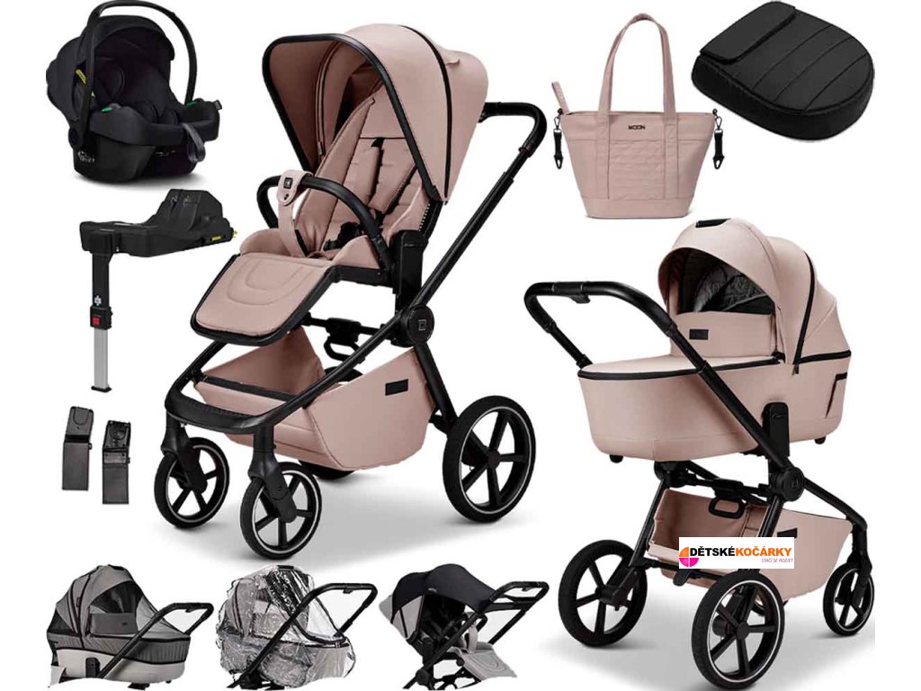 Set obsahuje: podvozek MOON Resea 2.0 + sportovní sedačku + hlubokou korbu + autosedačku Cosmo Black + Isofix Base Cosmo 2.0 + adaptéry pro usazení autosedačky + pláštěnku + moskytiéru + sluneční clonu + nánožník na sportovní sedačku ve variantě Black + přebalovací tašku v designu kočárku