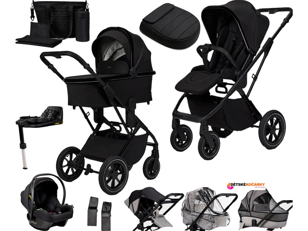 Set obsahuje: podvozek MOON PIÚ + hlubokou korbu s matrací včetně paměťových adaptérů + sportovní sedačku včetně paměťových adaptérů + pláštěnku + nánožník na sportovní sedačku v černé barvě + adaptéry na autosedačku + autosedačku Cosmo Black + základnu Isofix IQ Orbit + přebalovací tašku onyx black + moskytiéru + sluneční clonu