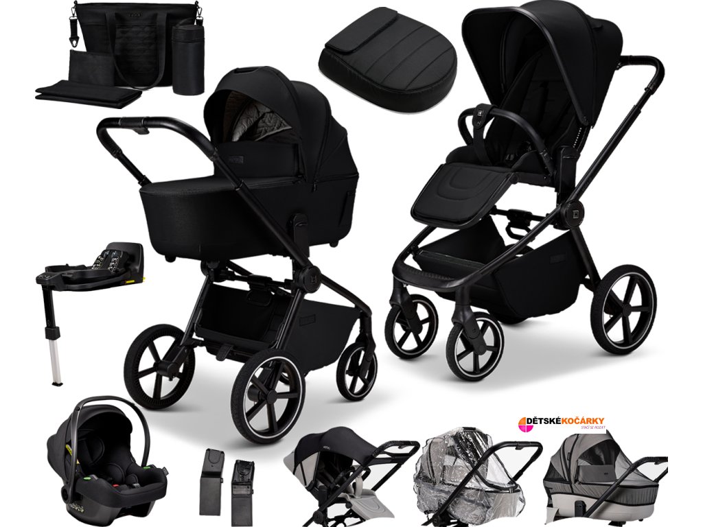 Set obsahuje: podvozek MOON Resea 2.0 + sportovní sedačku + hlubokou korbu + autosedačku Cosmo Black + základnu Isofix IQ Orbit + adaptéry pro usazení autosedačky + pláštěnku + moskytiéru + sluneční clonu + nánožník na sportovní sedačku ve variantě Black + přebalovací tašku v designu kočárku