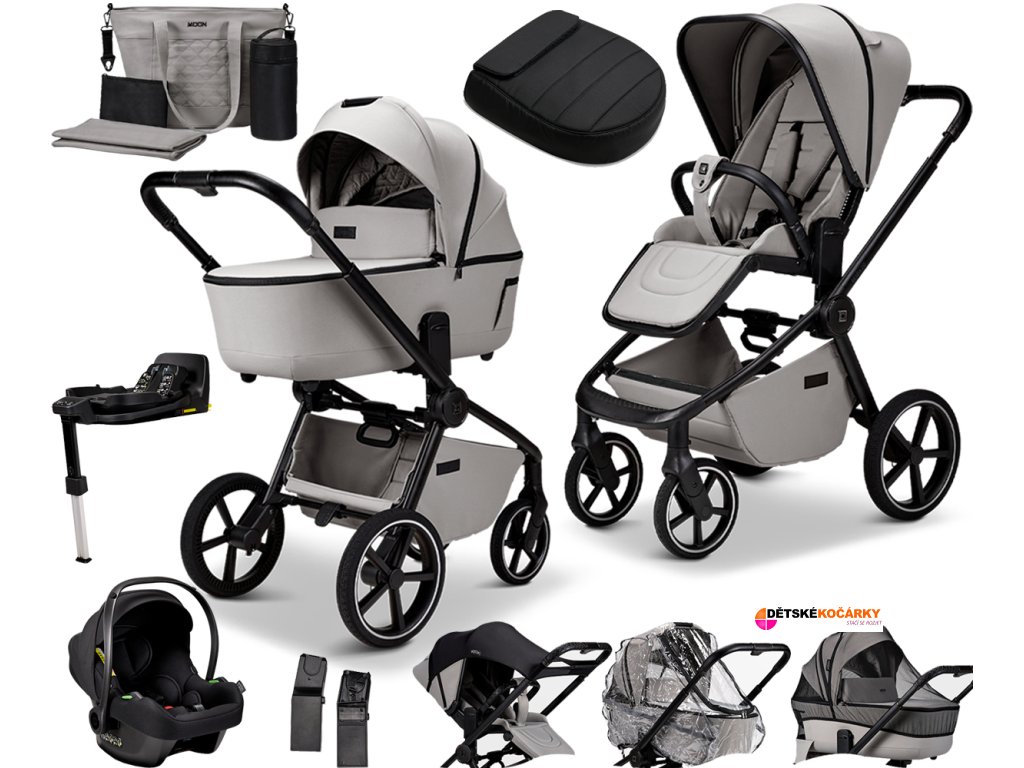 Set obsahuje: podvozek MOON Resea 2.0 + sportovní sedačku + hlubokou korbu + autosedačku Cosmo Black + základnu Isofix IQ Orbit + adaptéry pro usazení autosedačky + pláštěnku + moskytiéru + sluneční clonu + nánožník na sportovní sedačku ve variantě Black + přebalovací tašku v designu kočárku