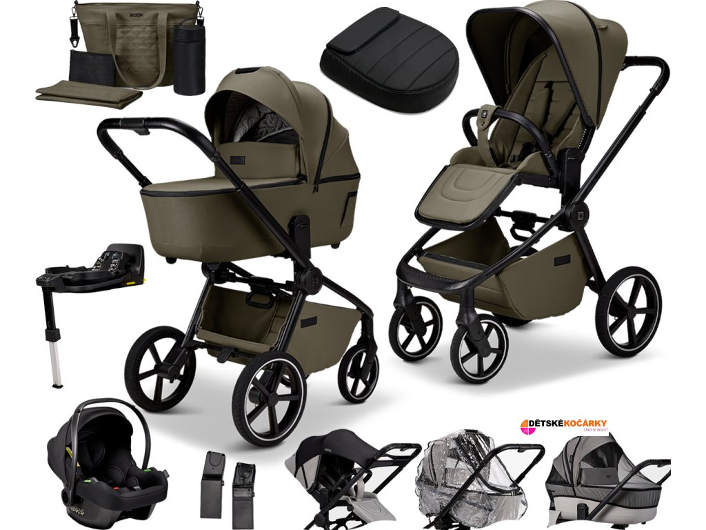 Set obsahuje: podvozek MOON Resea 2.0 + sportovní sedačku + hlubokou korbu + autosedačku Cosmo Black + základnu Isofix IQ Orbit + adaptéry pro usazení autosedačky + pláštěnku + moskytiéru + sluneční clonu + nánožník na sportovní sedačku ve variantě Black + přebalovací tašku v designu kočárku