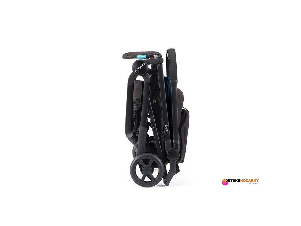 - složený kočárek stojí sám, rukojetí nahoru a je velmi kompaktní