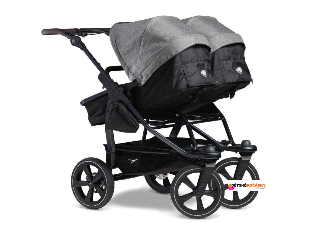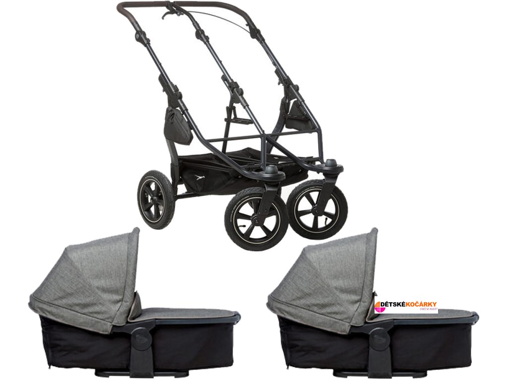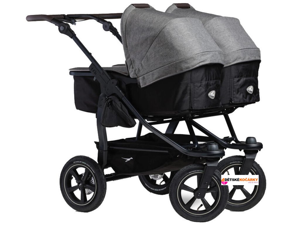 Set obsahuje: konstrukci kočárku TFK Duo2 frame Air Wheel s nafukovacími koly + 2x hlubokou korbu TFK Carrycot Duo2 Combi Premium s možností přestavění na sportovní nástavbu + adaptéry + košík pod kočárek