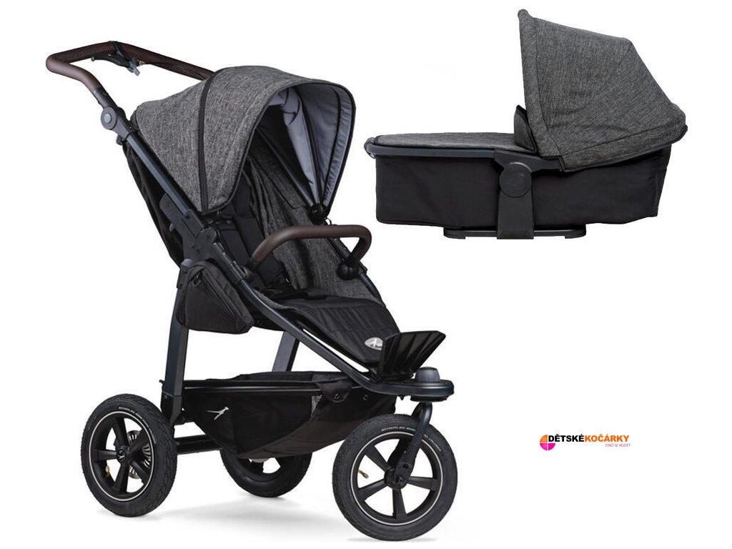 Set obsahuje: sportovní kočárek TFK Mono2 Air Wheel Premium s nafukovacími koly + nastavitelné madlo + košík pod kočárek + hlubokou korbu TFK Carrycot Mono2 Combi Unit Premium