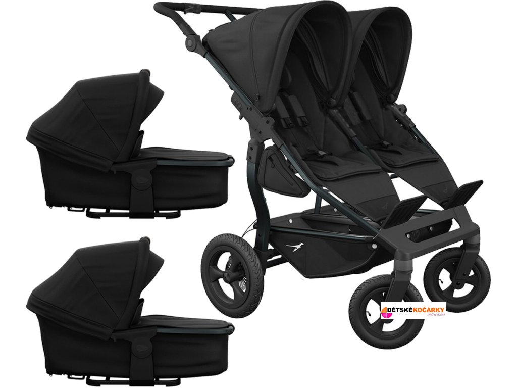 Set obsahuje: podvozek TFK duo frame - air wheel + 2x sportovní sedačku TFK Stroller seats duo + 2x hlubokou korbu TFK Carrycot duo combi přestavitelnou na sportovní sedačku