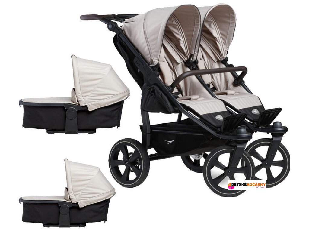 Set obsahuje: konstrukci kočárku TFK Duo2 frame Air Wheel se vzducho komorovými koly Air Chamber + 2x hlubokou korbu TFK Carrycot Duo Combi s možností přestavění na sportovní nástavbu + 2x sportovní sedačku TFK Stroller seat duo2 + adaptéry + košík pod kočárek