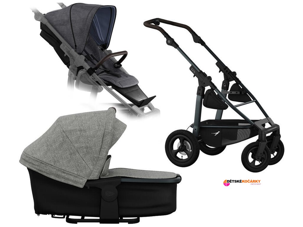 Set obsahuje: TFK Mono 4 frame air wheel + hlubokou korbu TFK Carrycot Mono3, 4/Pro combi unit Premium + sportovní sedačku TFK Stroller seat unit mono/pro Premium