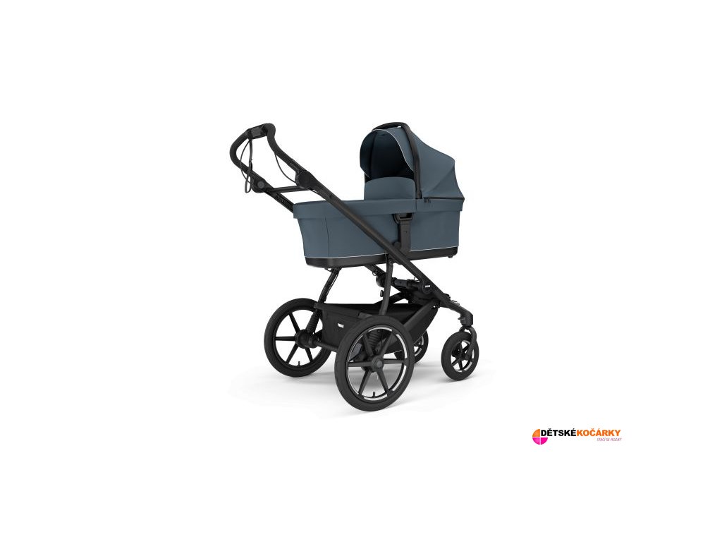 Set obsahuje: podvozek THULE Urban Glide 4-wheel + tkaninu sportovní sedačky + prostorný nákupní košík + hlubokou korbu THULE Bassinet