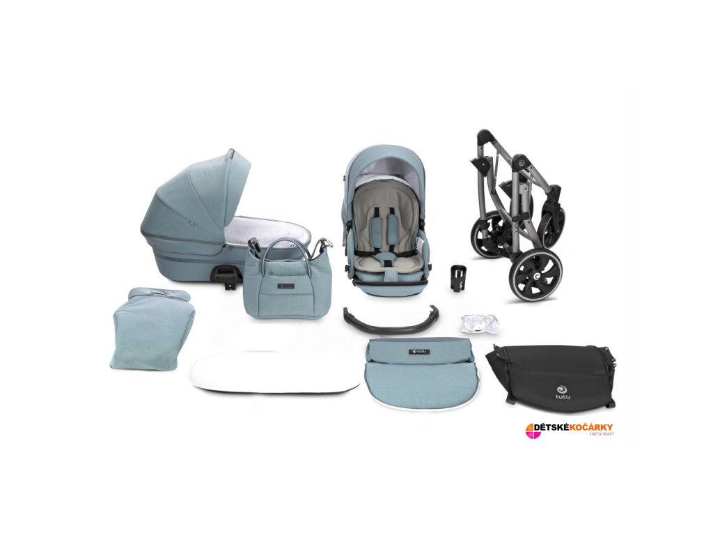 Set obsahuje: podvozek s koly + sportovní sedačku s bezpečnostními pásy + hlubokou korbičku + stříšku a nánožník pro korbičku i sportovní sedačku + přebalovací tašku + nákupní košík + držák nápojů + pláštěnku + moskytiéru
