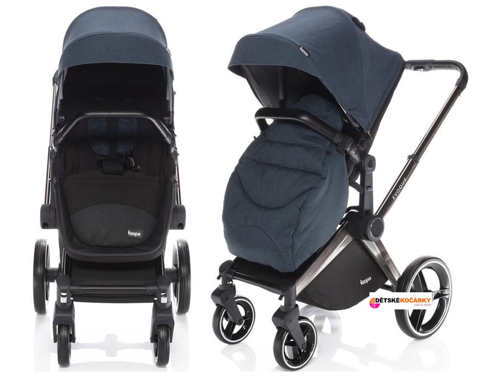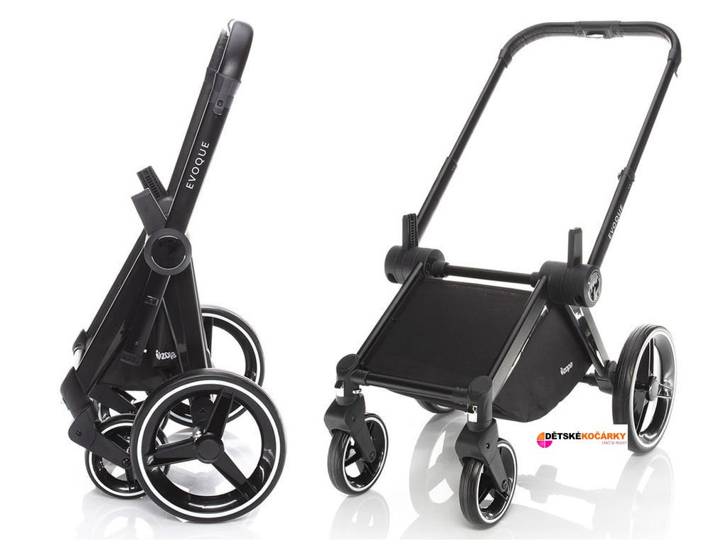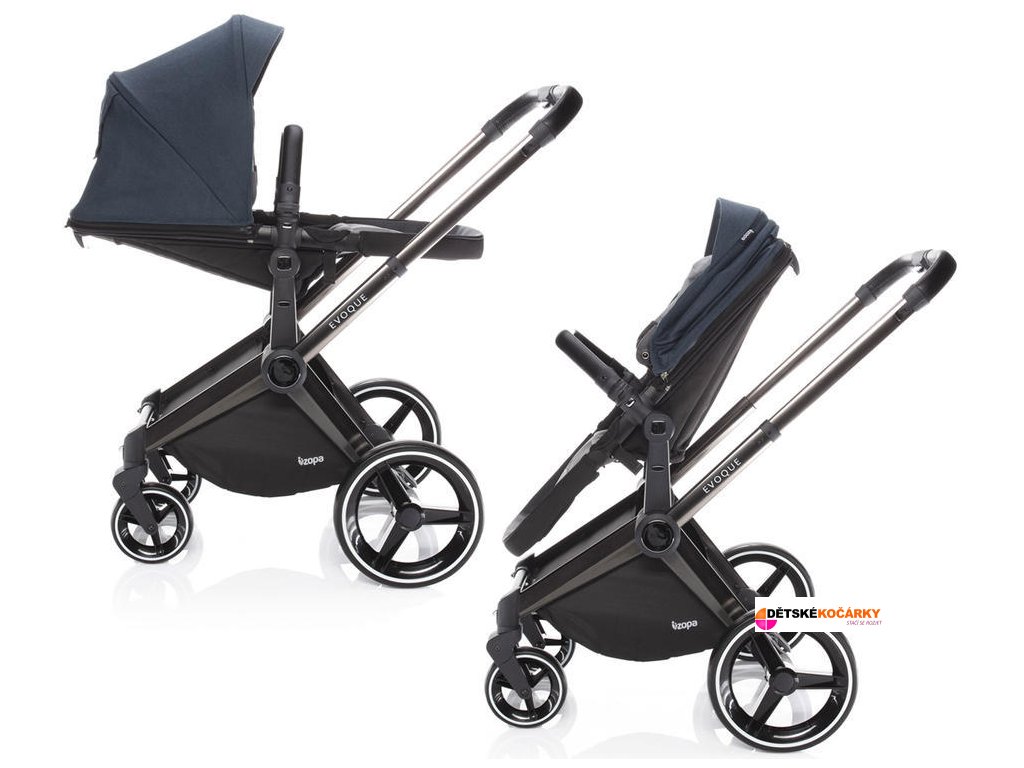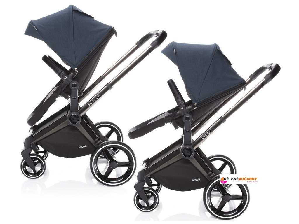 Kočárek ZOPA Evoque je designový ale zároveň praktický kočárek pro děti od narození do 15 kilogramů. Jedná se o dvojkombinaci, kdy se z rámu prostorné, hluboké korby vytvoří sportovní sezení. Sportovní sedačka kočárku je polohovatelná, lze ji umísti po i proti směru jízdy a dítě v ní chrání 5-ti bodový bezpečnostní pás. Samozřejmostí je pak výškově nastavitelná rukojeť, která je stejně jako odnímatelná hrazda potažena ekokůží. Kočárek lze snadno složit. Podvozek i ve složeném stavu sám stojí, proti rozložení ho jistí pojistka. Podvozek kočárku je nabízen ve 4 barevných kombinacích, barevné sety pak v barvách Butterfly, Grey Melange, Jeans, Jungle a Petrol Blue