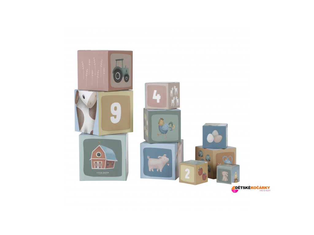Barevné kartonové kostky LITTLE DUTCH s krásnými ilustracemi motivů ze života na farmě. Nechte vaše dítě kostky skládat na sebe do vysoké věže nebo vedle sebe podle velikosti. Ve starším věku se dítě s pomocí očíslovaných kostek může hravým způsobem učit počítat i rozpoznávat číslice. Nejmenší kostka má 5 cm a největší má 14 cm. Po skončení hraní kostky snadno uložíte složením do sebe.