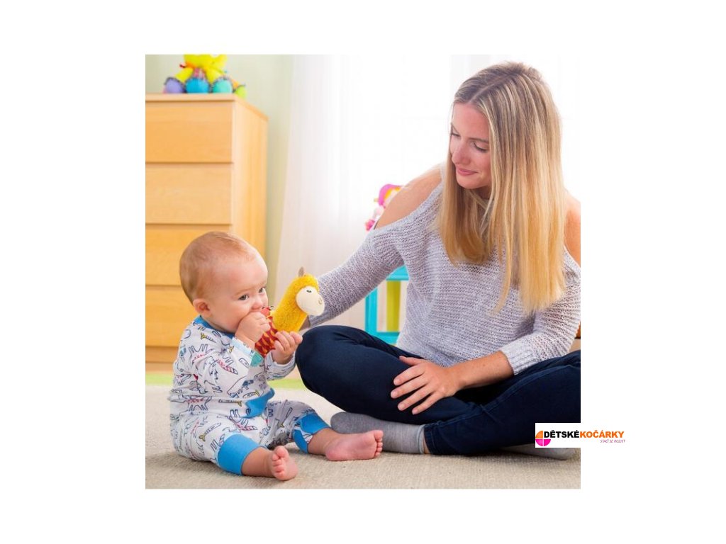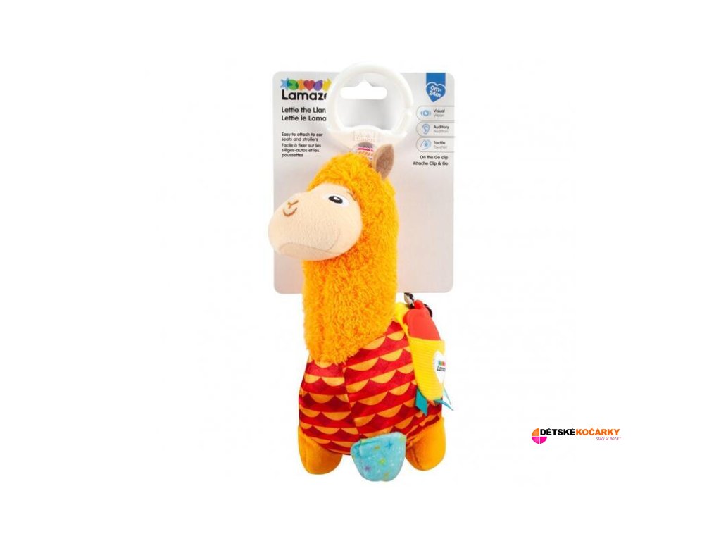 Lama Laura od LAMAZE je vyrobena z různě strukturovaných a barevných materiálů, které stimulují zrak, hmat a rozvíjí motoriku. Bříško při doteku šustí, kousátko ve tvaru jablka umístěné v kapsičce uleví při prořezávání zoubků bolavým dásním, při zatřesení hračka jemně cinká.