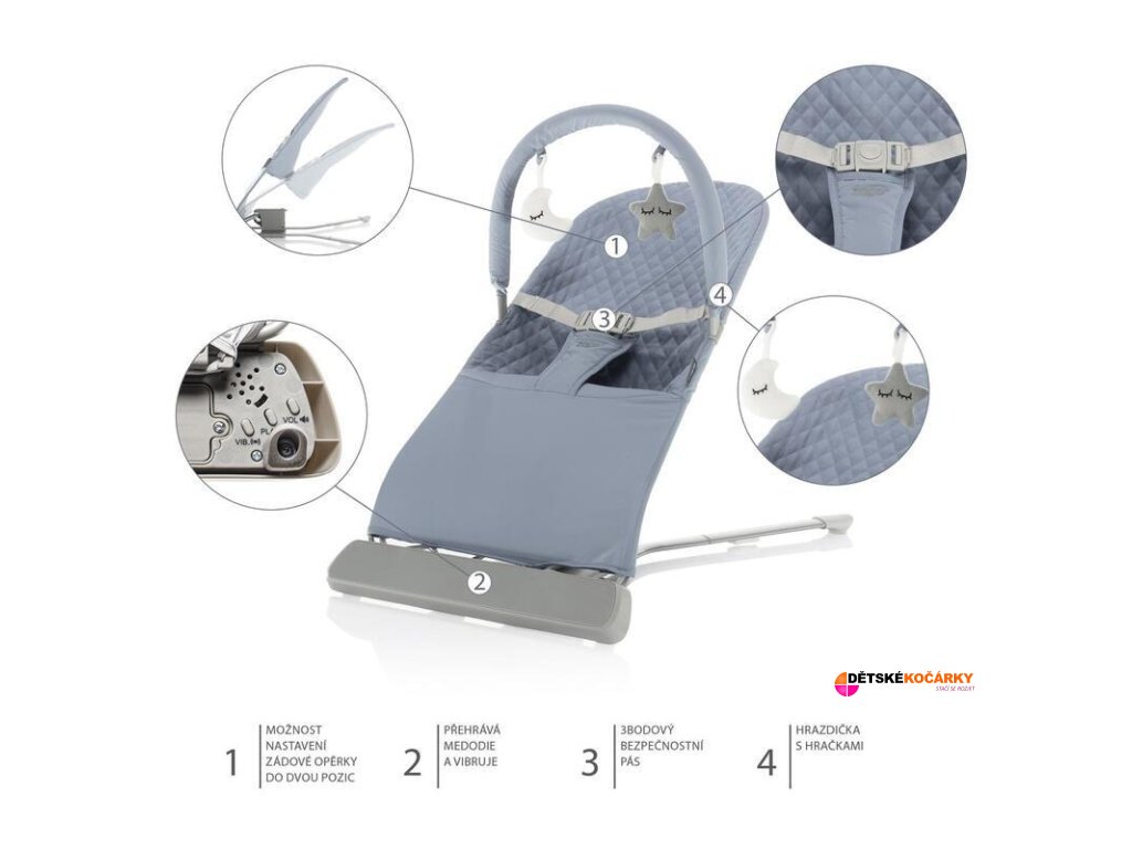 Lehačka ZOPA Siesta zajistí Vašemu děťátku perfektní odpočinek pomocí jemných vibrací a pohodlnému polstrování v moderním designu. Své děťátko máte stále na očích, bez nutnosti složitě přesouvat postýlku do jiné místnosti. Nemusíte se strachovat, že děťátko upadne ze sedačky, a navíc se o perfektní odpočinek nejmenšího člena rodiny postará uklidňující melodie a příjemné vibrace. Čas strávený v lehačce dokáže být nejen odpočinkem, ale také zábava díky hrazdě na hračky, která stimuluje smysly miminka.