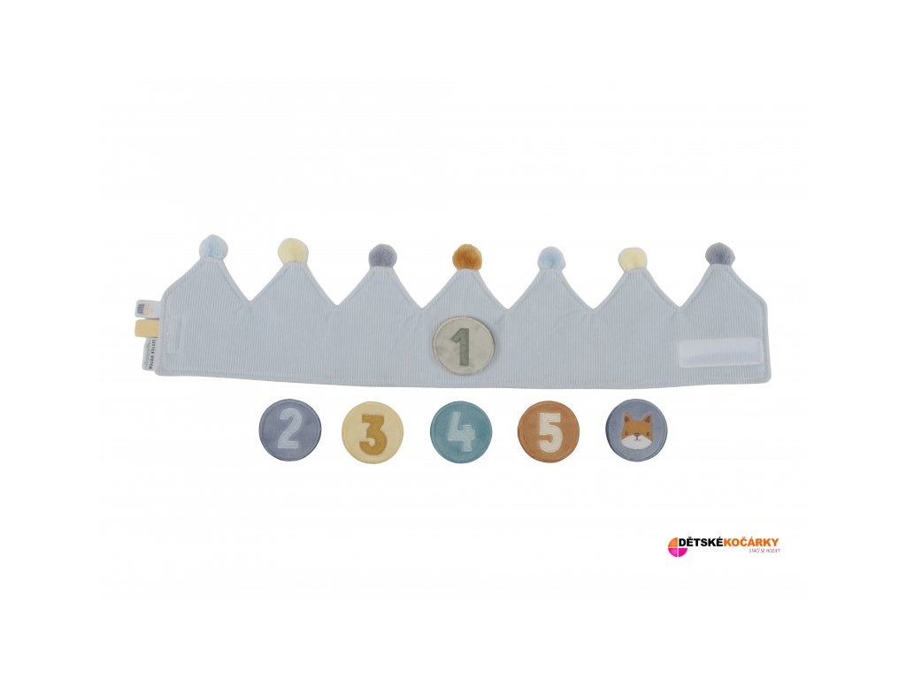 Krásná textilní korunka LITTLE DUTCH pro malého oslavence či oslavenkyni ozvláštní originálním způsobem narozeninový den vašeho dítěte. Korunka nabízí výměnná čísla 1-5 a je tak ideální pro použití od prvních do pátých narozenin. Neutrální kolečko s obrázkem květiny pak můžete na korunku umístit kdykoli při hraní na princeznu či krále. Zapínání na suchý zip umožňuje přizpůsobit korunku velikosti hlavy dítěte.