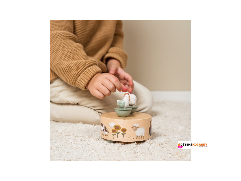 Hudební box LITTLE DUTCH v krásném dřevěném provedení s ilustracemi motivů ze života na farmě hraje po natažení melodii „Old MacDonald Had a Farm“, zatímco ovečka a slepička ladně tančí. Hudební box je součástí designové kolekce LITTLE DUTCH Farma, ve které najdete dekorativní doplňky do dětského pokoje, ložní prádlo, dřevěné a plyšové hračky i jídelní doplňky pro dětské stolování.