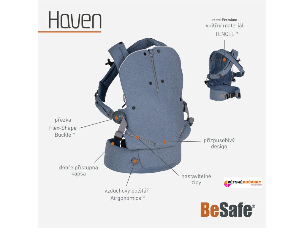 Nosítko BESAFE iZi Haven Basic je speciálně navržené tak, aby podporovalo ideální „žabí" pozici nožiček. Nosítko je navíc testované vysoce respektovaným isntitutem Die Trageschule®e.K. v Německu. Speciální pružné materiály umožňují, aby se tvar perfektně přizpůsobil tělu dítěte. Unikátní a patentovaný vzduchový polštář Airgonomics ™ podpírá dítě a rovnoměrně rozkládá váhu, když sedí směrem ven od těla nosiče. Pro komfortní prostředí je uvnitř nosítka přírodní materiál absorbující vlhkost TENCEL ™ . Sklopná opěrka hlavy dává dítěti extra prostor a skvělý výhled. Velikostně nastavitelné ramenní popruhy poskytují více prostoru pro hlavu dítěte. Plynule nastavitelné a polstrované zipy umožňují ergonomickou polohu při sezení směrem ven od nosiče. Měkká a odnímatelná sluneční stříška s UPF50 + chrání před slunečním zářením, eliminuje podněty a dodává další podporu hlavy. Spona Flex-Shape ™ má jedinečnou konstrukci, která se automaticky otáčí do polohy, která nejlépe odpovídá tvaru a velikosti rodiče. Žádné další úpravy, žádné zařezávání řemínků do kůže, žádné volné uchycení řemínku.