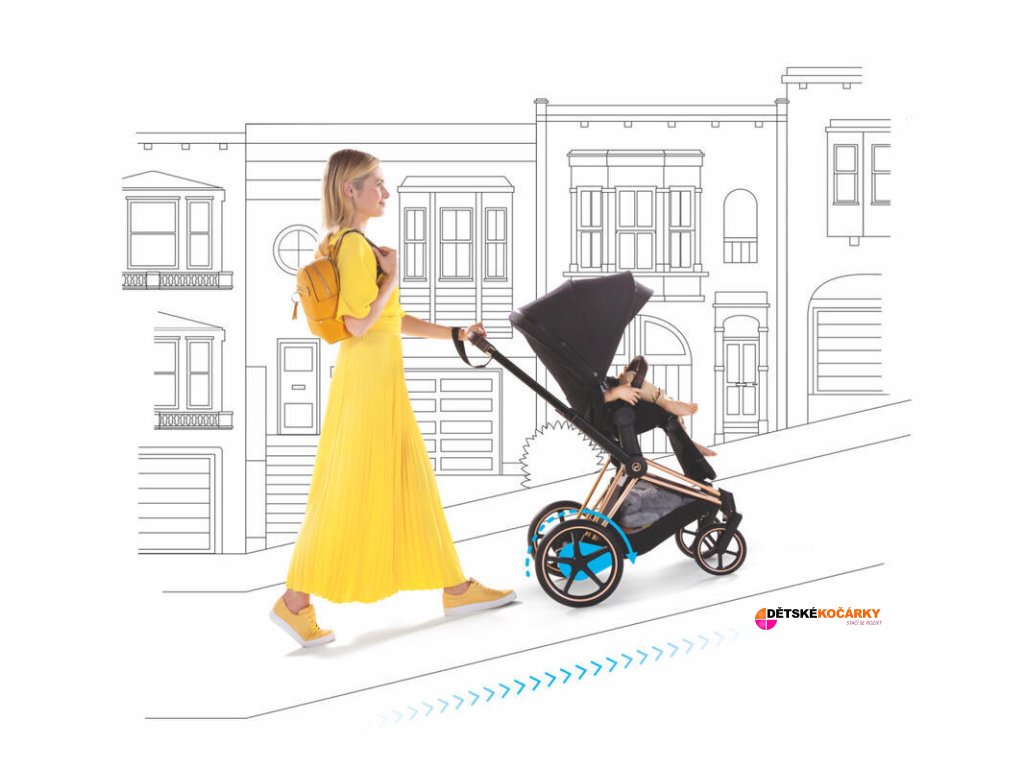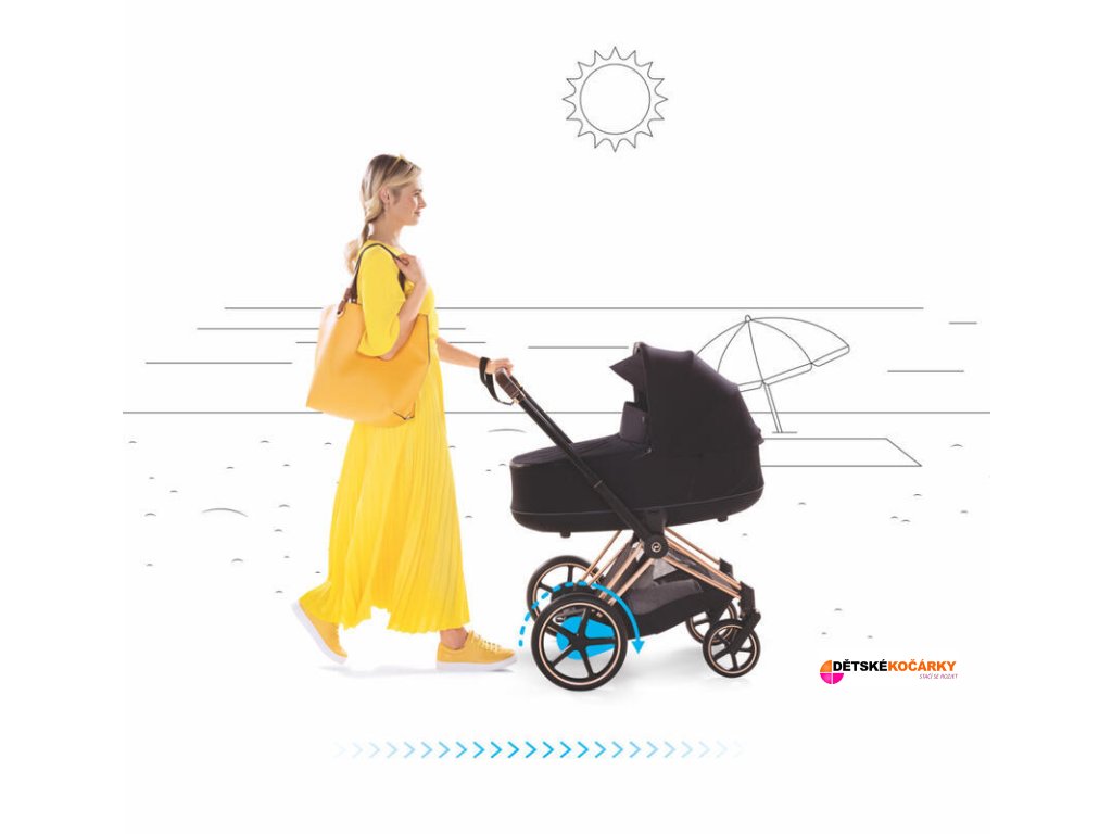 - nové odpružení všech kol kočárku PRIAM zajišťuje hladkou, klidnou a pohodlnou jízdu pro rodiče i dítě
