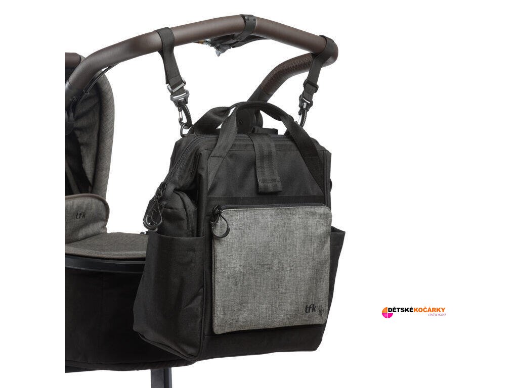Společně s renomovaným výrobcem Lässig byla navržena perfektní taška nejen na plenky pro váš kočárek TFK. Přebalovací tašku snadno připevníte ke kočárku, můžete ji nosit jako běžnou tašku nebo dokonce jako batoh díky neviditelně skladným popruhům.