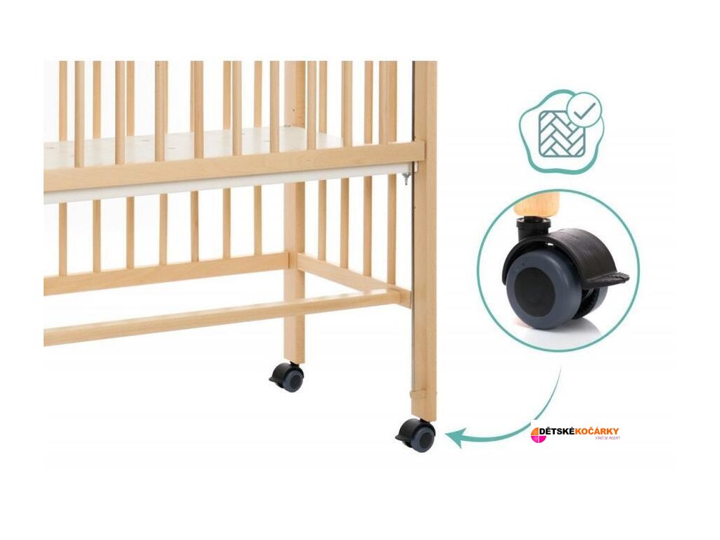 Přístavná postýlka Cocon od FILLIKID v sobě spojuje praktickou přídavnou postel s funkcí samostatné postýlky. Přes den může malá postýlka na kolečkách sloužit jako společenské lůžko. Popruhy ve své funkci rozkládacího lůžka udržují místo na spaní vašeho dítěte vždy pevně připevněné k velké rodičovské posteli. Snadno se připevňuje, odpojení také nezabere téměř žádný čas. Díky čtyřem kolečkům s hladkým chodem může postýlka během dne rychle zmizet v koutě, kde nebude překážet. Pokud ale potřebujete dětskou postýlku i do kuchyně, obývacího pokoje nebo pracovny, jednoduše zavřete otevřenou stranu pomocí integrované posuvné postranice a vytvoříte tak pro nejmenší bezpečné a mobilní denní místo. Ve dne i v noci poskytuje pětipolohová výškově nastavitelná základna vždy potřebnou flexibilitu. Díky otevřeným postranicím a děrovanému roštu má vaše miminko vždy dostatek čerstvého vzduchu a nejsou blokovány zvědavé pohledy do okolí. Masivní bukové dřevo poskytuje potřebnou stabilitu a zároveň zajišťuje dlouhou životnost i při každodenním pohybu a užívání.