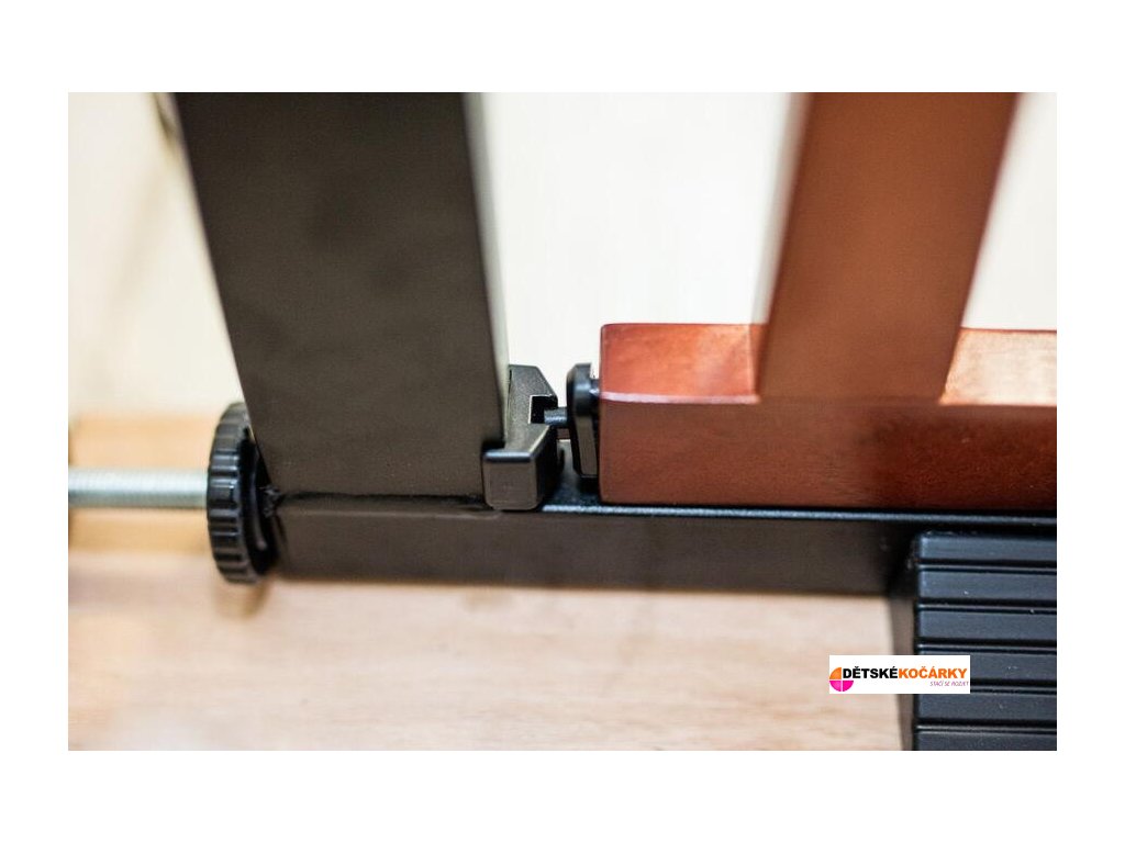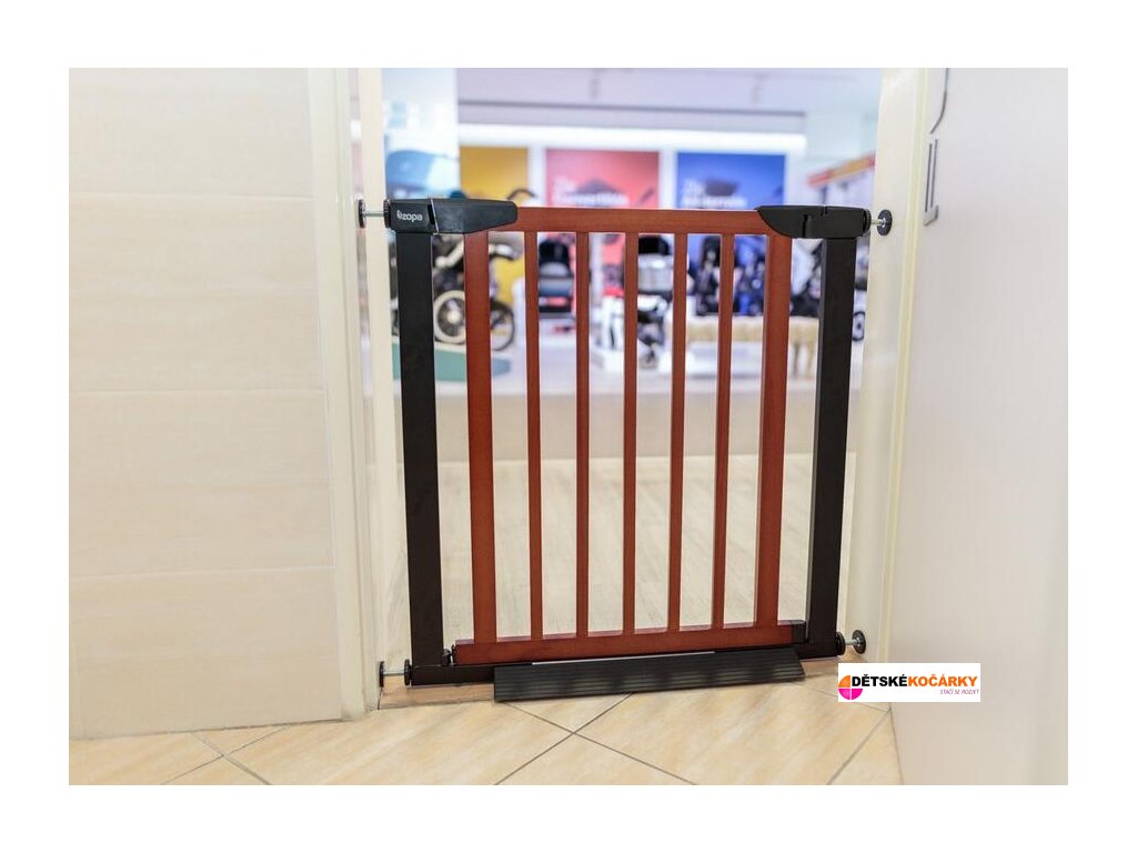 Pevný kovový rám ve tvaru písmene ,,U“ umožňuje snadnou montáž rozepřením. Poskytuje mimořádně široký průchod, který neomezuje v pohybu. Zábranu lze snadno namontovat bez vrtání. Zábrana je určena pro otvory od 75cm do 82cm, pomocí rozšíření, které je součástí balení, lze zábranu umístit do otvorů až do 96cm. Rampa, která je taktéž součástí balení, usnadní průchod přes zábranu. Jednoduché otevírání jednou rukou usnadní manipulaci. Kovová konstrukce v černé barvě v kombinaci s třešňovým dřevem povyšuje zábranu na designový prvek. Splňuje normu EN 1930:2011 a ASTM F1004-13 a je vhodná pro použití u dětí do 24 měsíců.