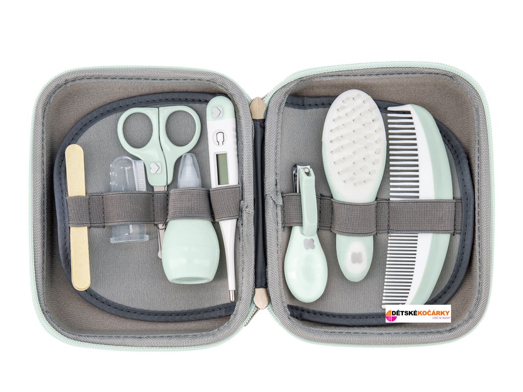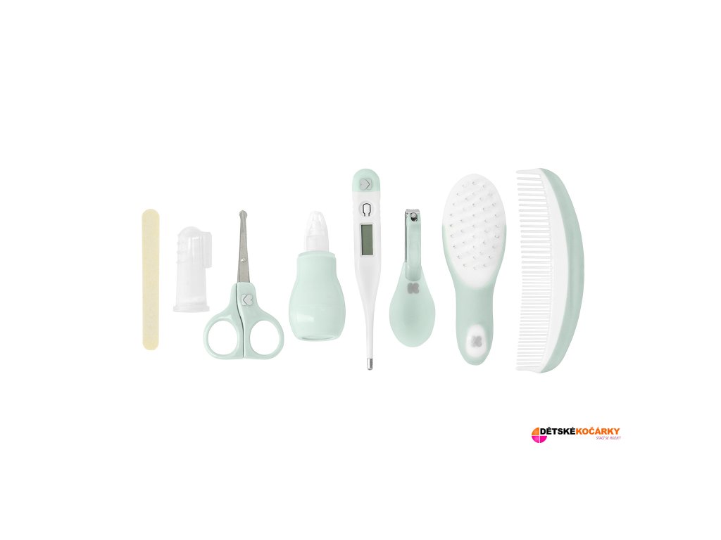 Sada hygienických potřeb KIKKABOO pro péči o vaše dítě od narození obsahuje digitální teploměr, nosní odsávačku, hřeben, kartáč na vlasy, masážní kartáček na zuby a dásně, kleštičky na nehty, nůžky a pilníčky na nehty. Všechny potřeby jsou uchyceny pružnými úchyty v praktickém pouzdru, které je pohodlné na přenášení a ideální i na cesty.
