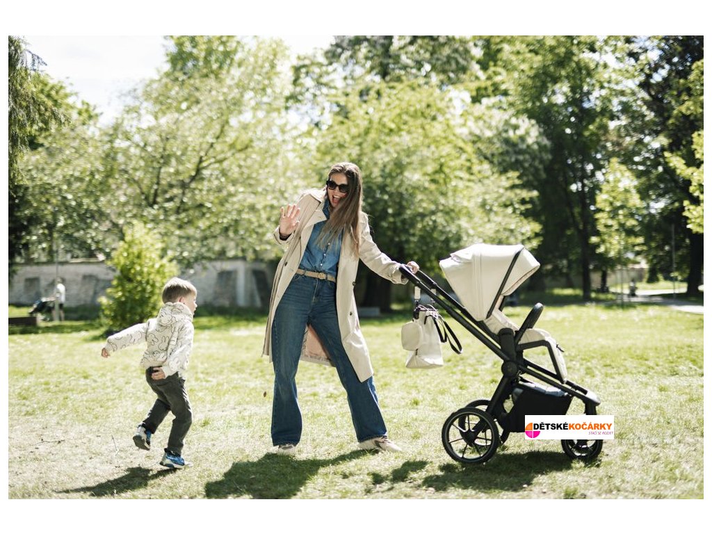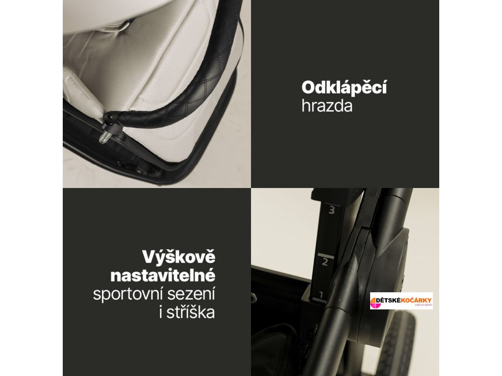 Praktickými detaily jsou magnetická spona pásu, uzavíratelný košík, odklápěcí hrazda a madlo pro snadné přenášení složeného kočárku. Kočárek se snadno skládá a přenáší, a to i jednou rukou. Ve výbavě nechybí pláštěnka, nánožník a stylová přebalovací taška.