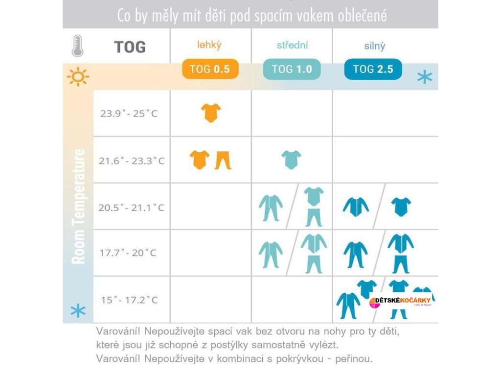 Před uložením dítětě do spacího pytle vždy zvolte přiměřené oblečení s ohledem na pokojovou teplotu. Indikativně naleznete instrukce v ČSN EN 16781.