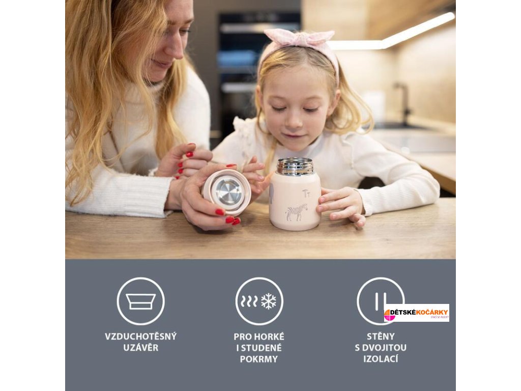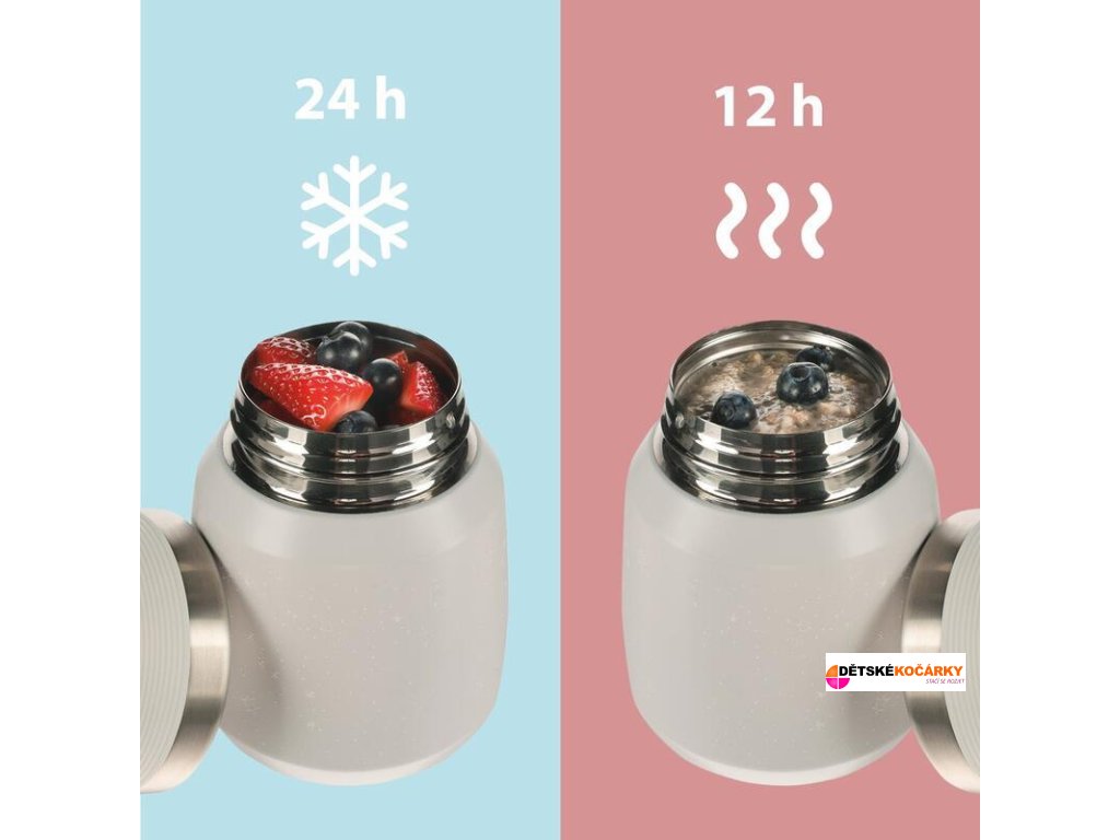 Kvalitní termoska na jídlo a příkrmy ZOPA o objemu 300 ml uchovává horké jídlo až 12 hodin, studené až po dobu 24 hodin. Je vyrobena z kvalitní nerezové oceli, která je odolná vůči korozi. Těsné víčko zajišťuje, že termoska neprotéká. Díky vakuové izolaci se termoska při naplnění horkým obsahem nezahřívá z venku.