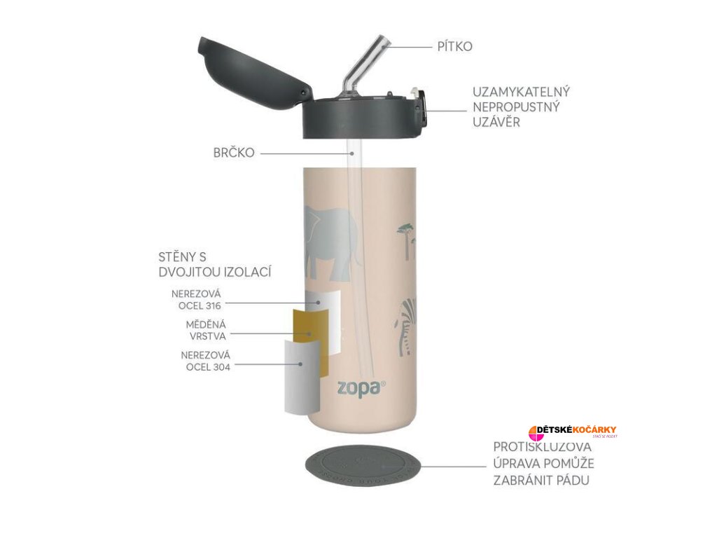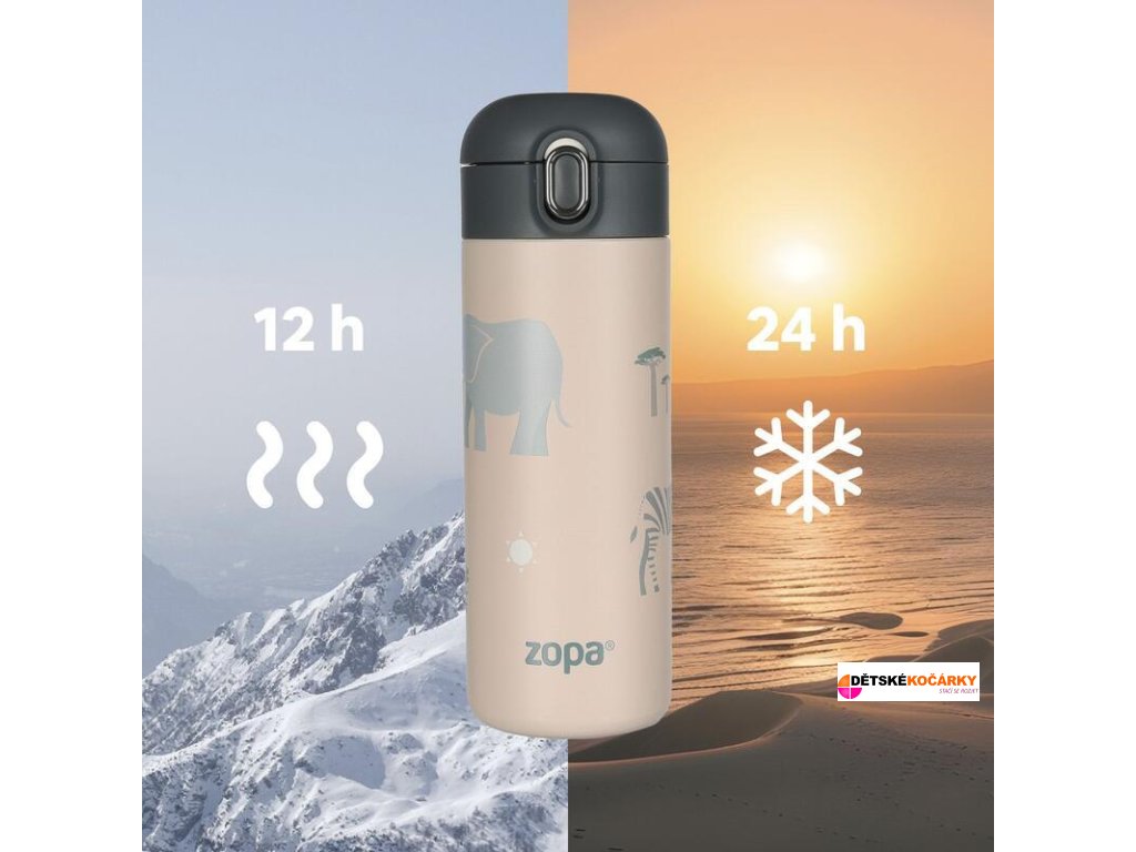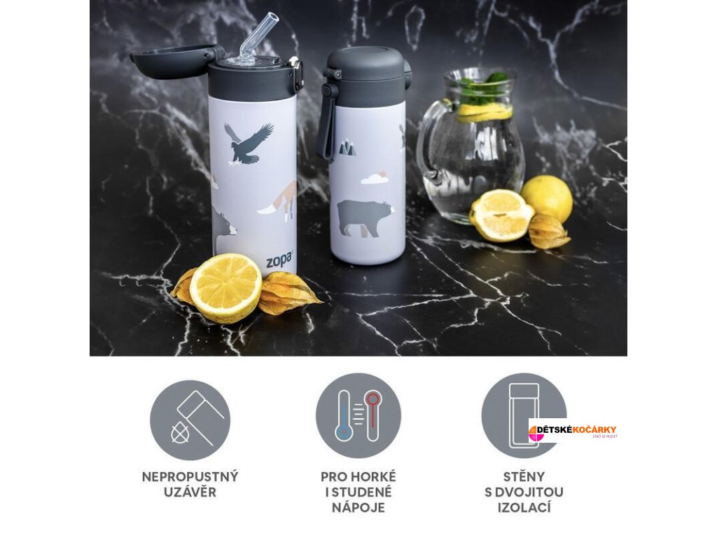 Designová termoska ZOPA s veselými motivy o objemu 400 ml je díky kvalitnímu vzduchotěsnému uzávěru a dvojité stěně z nerezové oceli připravena udržet jakékoliv tekutiny vždy v optimální teplotě po dlouhou dobu - horké nápoje uchovává teplé až 12 hodin a chladné až po dobu 24 hodin. Vaše dítě tak bude mít svůj oblíbený nápoj stále při ruce, ať už se vydá za dobrodružství kamkoliv. Těsné víčko zajišťuje, že z termosky neunikne ani kapka a nemusíte mít tak obavu z jejího vylití. Součástí je i měkké silikonové pítko ve tvaru brčka, které děti tak zbožňují.