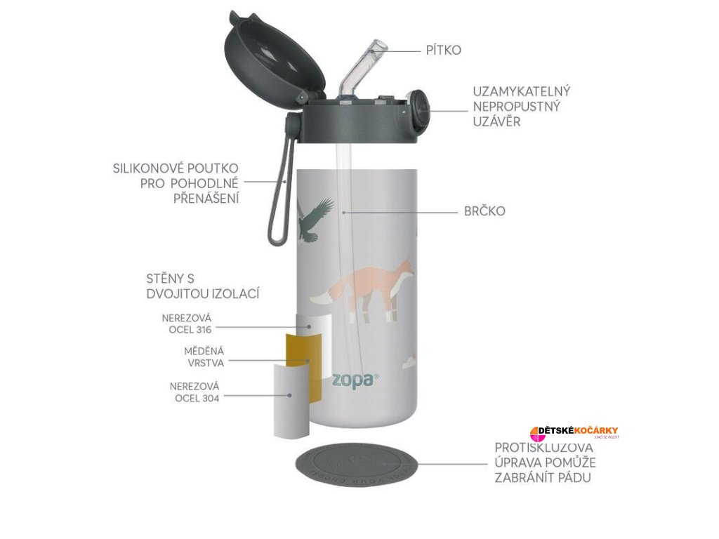 Designová termoska ZOPA s veselými motivy o objemu 350 ml, vybavená spolehlivým vzduchotěsným uzávěrem a dvojitou vrstvou kvalitní nerezové oceli, uchovává horké nápoje teplé až 12 hodin a chladné až 24 hodin. Do školky, školy, na hřiště i na výlety, termosku může mít vaše dítko stále při ruce. V parných dnech si může vychutnat osvěžující studenou vodu či oblíbenou ovocnou šťávu a v těch chladnějších ho zahřeje teplý lahodný čaj. Silikonové poutko umožňuje snadný přenos i úchop malých dětských rukou.